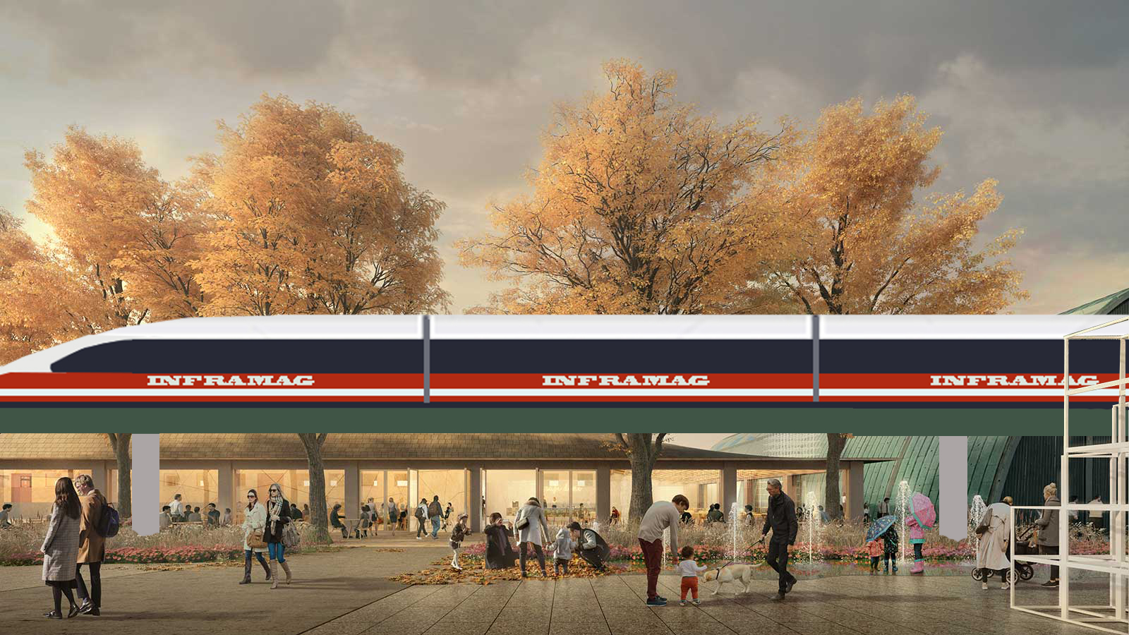 A railway on pillars offers great advantages. The risk of accidents between trains and animals, people and other vehicles is minimal. All activities can continue under the tracks (see images below) in communities as well as in the countryside and in the forest. Stations in city centers make it easy for travelers to get on or off the train.